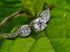 This spectacular engagement ring is ready to be added to your love story. The ring is set with a round diamond and is accented on the side with additional diamonds in a leaf pattern.