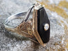 The ring is made in 10K yellow gold and has a gold border surrounding the black onyx and the base of the ring and shank is Sterling Silver. The ring is authentic to the period and is not a modern remake.