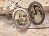 This beautiful engraved locket has a lovely floral engraved front, and the back has the initials of the original owner. But the true treasure is that it comes with a family photographed in black and white on a swing set outside a house.